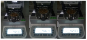 - 復(fù)位儀器,待儀器冷卻至40℃以下后,再取4.5g左右酒糟(93/94)均勻鋪在樣品盤上,重復(fù)上述測(cè)試步驟;測(cè)試結(jié)束后得出第二組數(shù)據(jù),顯示樣品的水分含量為433%;