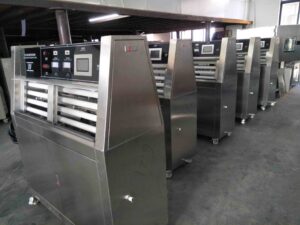本產品採用最佳類比陽光中UV段光譜的螢光紫外燈,并結合控溫、供濕等裝置來類比對材料造成變色、亮度、強度下降、開裂、剝落、粉化、氧化等損害的陽光(UV段)高溫、高濕、凝露、黑暗淋雨週期等因素,同時通過紫外光與濕氣之間的協同作用使得材料單一耐光能力或單一耐濕能力減弱或失效,從而廣泛用於對材料耐氣候性能的評價,設備具有提供最好的陽光UV模擬,使用維護成本低廉,易於使用,設備採用控制自動運行,試驗週期自動化程度高,燈光穩定性好,試驗結果重現率高等特點。 (適合小件產品或取樣測試)片狀產品為宜。