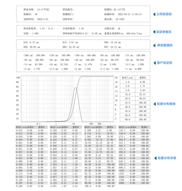 | 顯示模板 | 粒徑區(qū)間求百分比,以滿足不同行業(yè)對(duì)粒度測試的表征方式。徑距、一致性、區(qū)間累積等等 | |