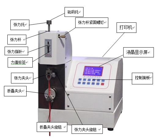 將所配給用戶的砝碼放在張力托上,(小的為4.9N,大的為9.8N)看張力指針是否指在對應刻度上,如有偏差,可用調節旋鈕調節,使指針對應標準刻度線,而后再將鎖緊旋鈕順時針鎖緊。(調節旋鈕鎖緊旋鈕的位置見儀器外觀圖)。
